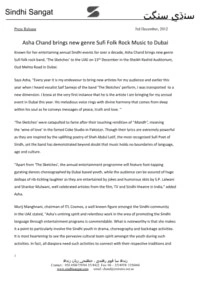 "Well known artists from India, Sindh and UAE will converge in Dubai including the famed youthful talented singer and composer Jatin Udasi. Udasi's powerful stirring voice will enthrall the audience while Shazia Khusk, a popular folk singer from Sindh will present an array of folk inspired songs tweaked with modern beats. Leading Hasya Kavi and standup comedian Ashok Sundrani will provide the audience a flavor of Sindhi comedy. Several dance performances will provide nonstop entertainment for the audience." Asha’s shows have the remarkable quality of creating spontaneous unity amongst people who share the same cultural identity. Says Asha Chand “Culture adds colour, richness and meaning in our lives. It is our responsibility to preserve our age old traditions in an increasingly globalised world.”